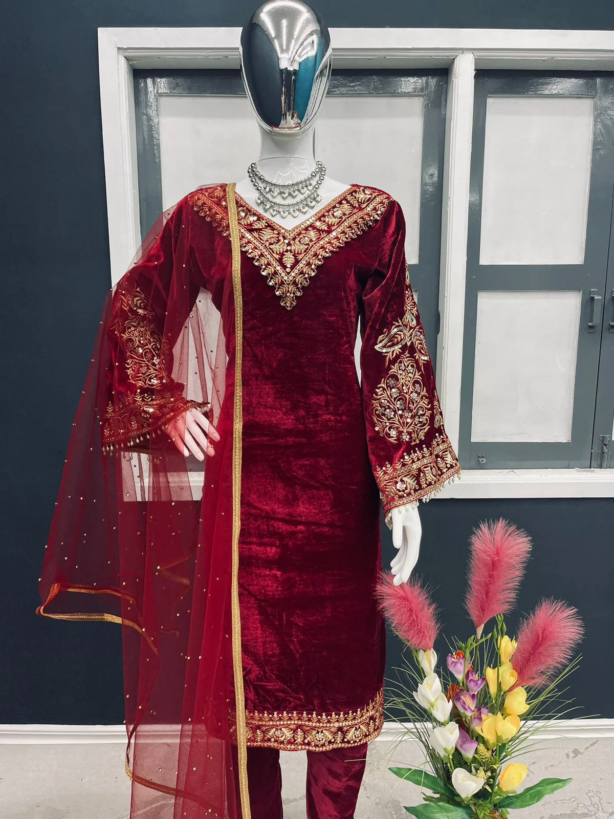 Delightful Maroon Color Viscose Velvet Salwar Suit
