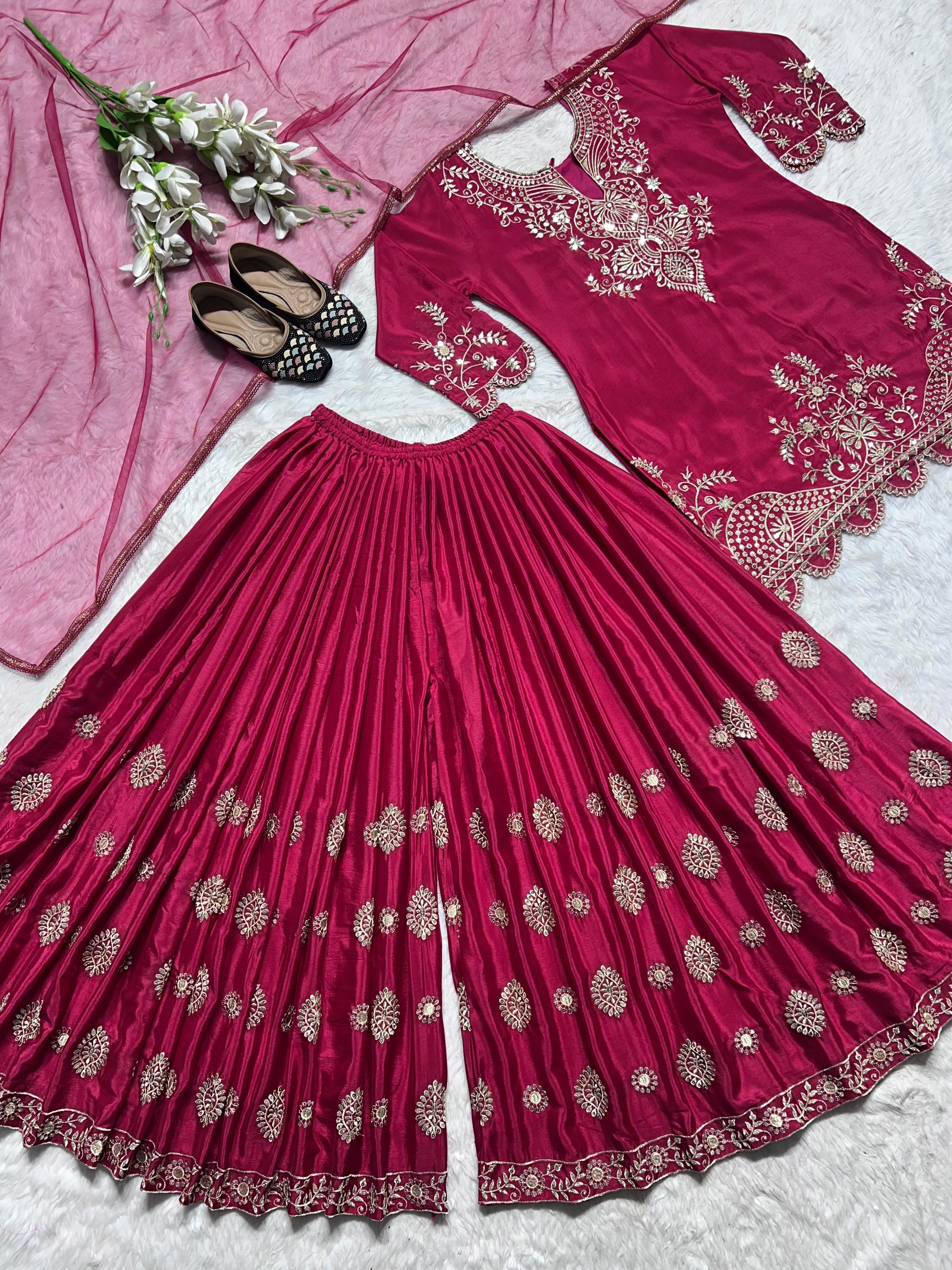 Designer Pink Color Heavy Pure Chinon Silk Embroidery Work Sharara Suit