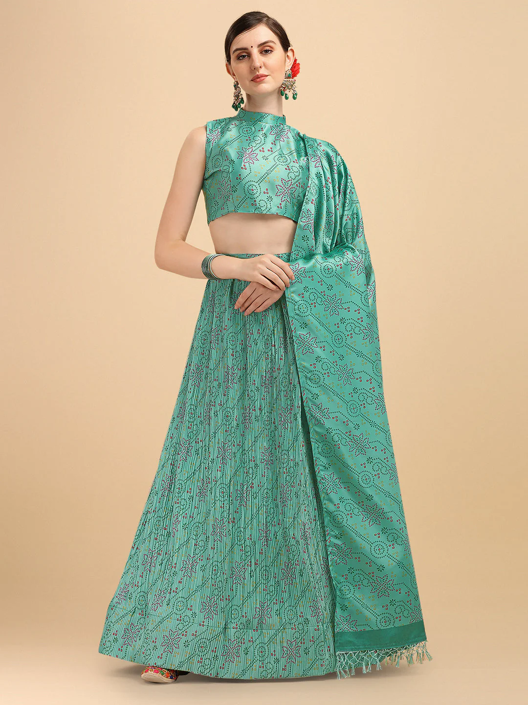 Digital Printed Turquoise Color Crushed Lehenga Choli