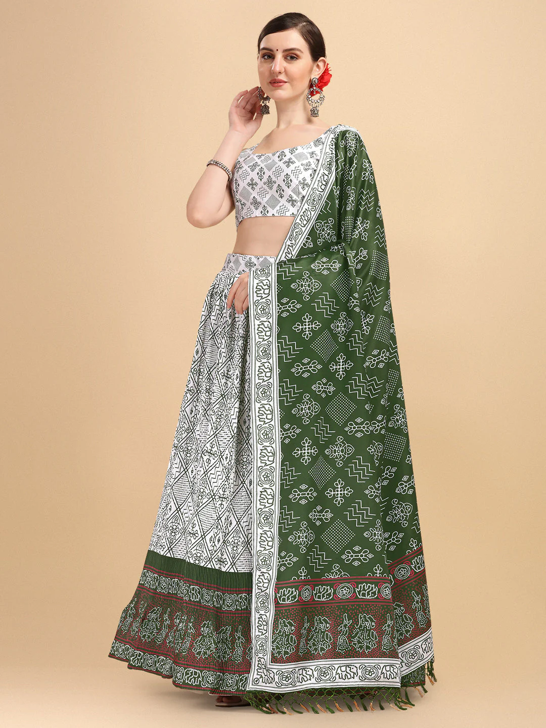 Glorious White & Green Color Digital Printed Crushed Lehenga Choli