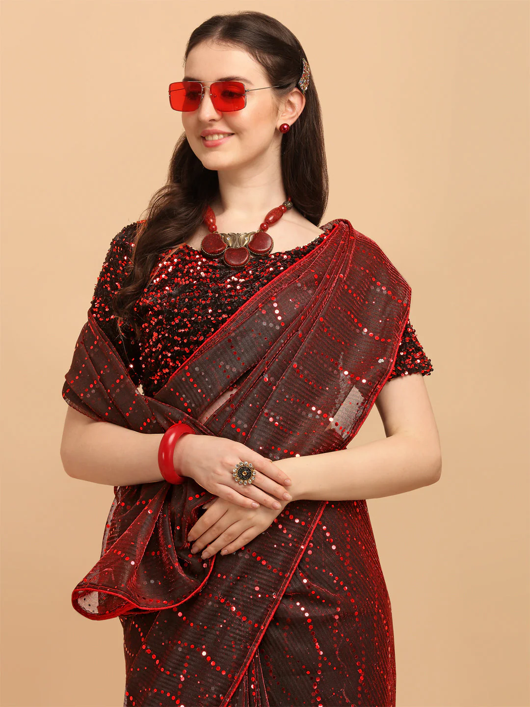-70%Opulent Red Net Saree With Sequences Blouse—