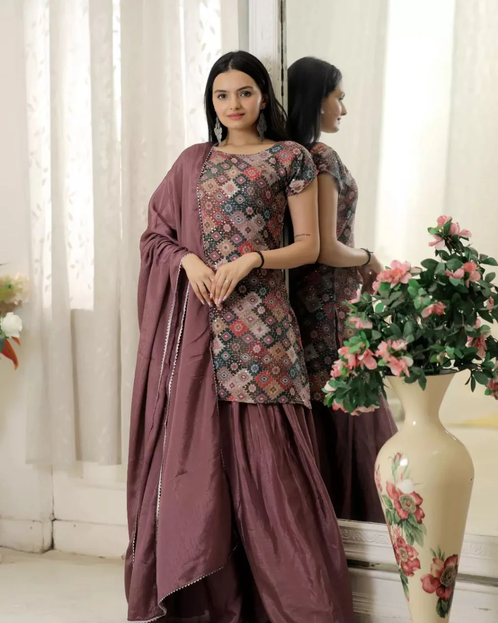 Pretty Dusty Pink Color Embroidered Work Sharara Suit